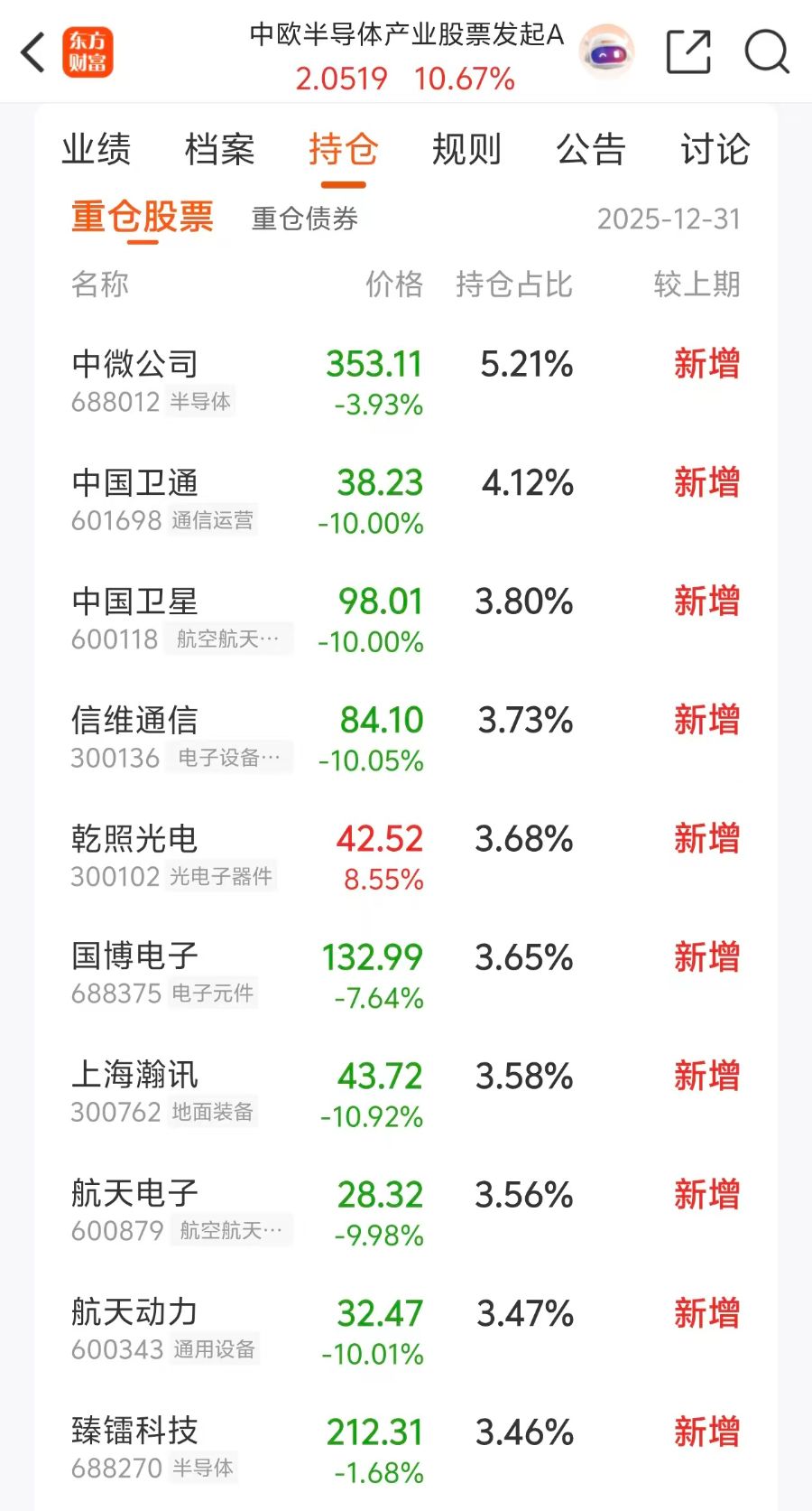 结果一看年末持仓,第一大重仓行业是航天装备,前十大重仓股好多商业航天的熟悉的名字。不知道今天商业航天这种跌法,中欧半导体要回调多少个点。